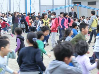 前半戦。ゼッケンをつけた集会委員さんが鬼になって追いかけると、低学年の子どもたちは、ほとんど全員が同じ方向に向かって集団で逃げ出していました。魚の群れのような迫力があります。
