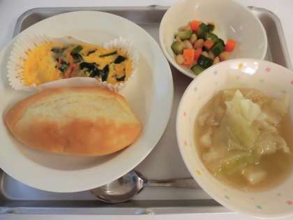 献立 ソフトフランスパン、ほうれん草のキッシュ、豆と野菜のマリネ、じゃが芋とキャベツのスープ、牛乳
