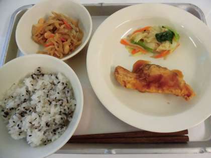 献立 ごまご飯、メルルーサの甘酢あんかけ、みそドレッシングサラダ、切干大根と大豆の煮付け、牛乳