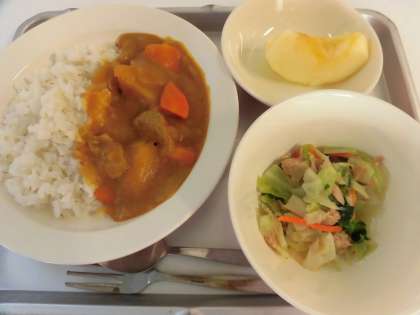 献立 カレーライス、ツナサラダ、果物(りんご)、牛乳