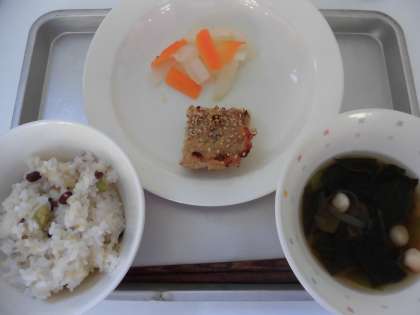 献立 新春おこわ、松風焼き、紅白なます、すまし汁、牛乳