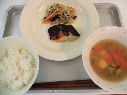献立 ご飯、さばのみそこうじ焼き、ほうれんそうとじゃこの和え物、みぞれ汁、牛乳