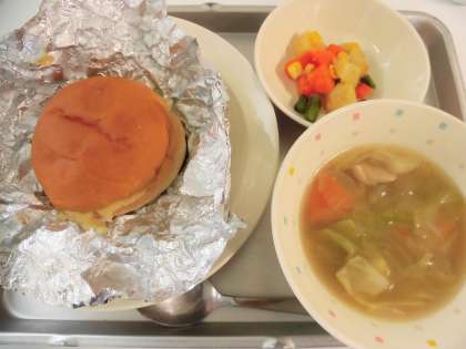 献立 ハムチーズサンド、スコッチブロス、カラフルポテトソテー、牛乳