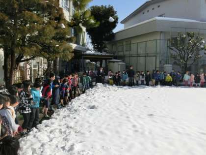 みんなが同時に雪に飛び込めるように、児童は校庭の周囲に並びます。