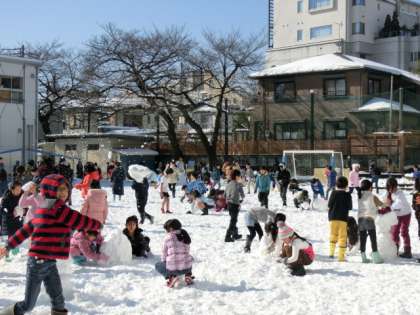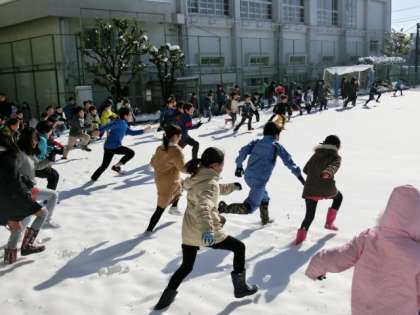 校長先生の「よーい、ドン」で、子どもたちは一斉に白銀の校庭に飛び出していきました。