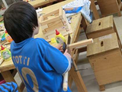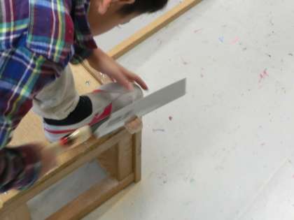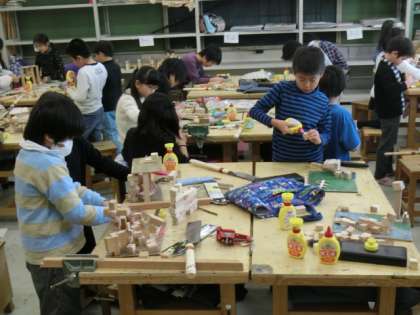 3年生は図工の授業で、のこぎりに挑戦中。角材を足で押さえながら小さなブロックをたくさん作り、積木のように自分の世界を作っています。