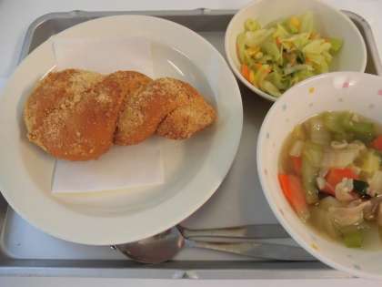 献立 きなこ揚げパン、具だくさん野菜スープ、コーン入りフレンチサラダ、牛乳
