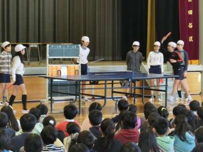 卓球クラブは試合の実演。音こそ小さいですが、白熱の試合を全校児童が集中して見守りました。
