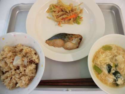 献立 里芋ご飯、さわらのゆうあん焼き、野菜のごまだれかけ、かきたま汁、牛乳