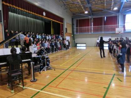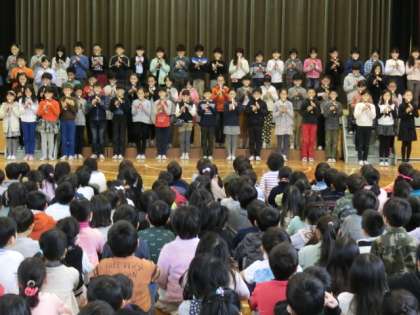 最後は音楽委員さんの伴奏で「天空の城ラピュタ」の「君を乗せて」を、全校児童で合唱。大きな声で歌えました。