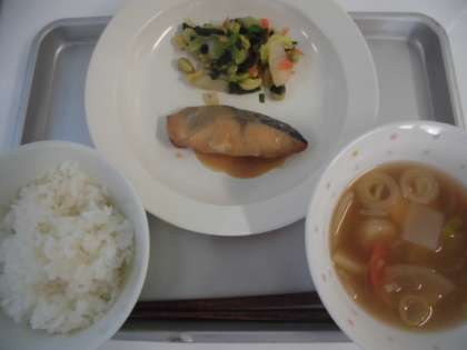 献立 ご飯、さわらのゆずみそかけ、青大豆入りお浸し、のっぺい汁、牛乳