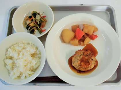 献立 元気ご飯、れんこんのつくね焼き、じゃが芋の煮物、野菜のおかか和え、牛乳