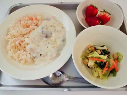 献立 チキンクリームライス、ひよこ豆入りゆで野菜、果物(いちご)、牛乳