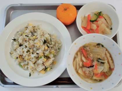 献立 高菜とじゃこのチャーハン、大根のごま酢和え、わんたんスープ、果物(ぽんかん)、牛乳