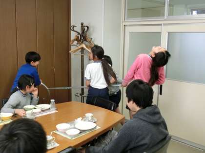 校長先生と一緒に給食をいただいた後は、普段とは違ってお茶会です。今日の話題は校長室にある防犯用具から、物理の話になった様子。
