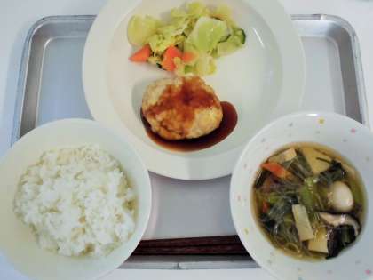 献立 ご飯、豆腐ハンバーグ、塩だれキャベツのサラダ、うずら卵入り春雨スープ、牛乳