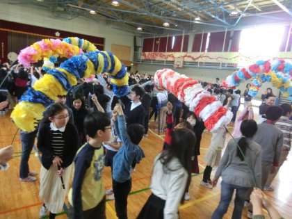 6年生からは、在校生のみんなに「明日への扉」の合奏を披露。アンコールの声が児童の間から自然に出てきました。また、6年生全員で縫った雑巾の贈呈もあり、「これで学校をきれいにしてください」とメッセージをくれました。