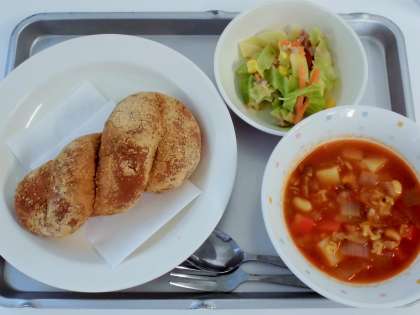 献立 きなこ揚げパン、ミネストローネ、ツナサラダ、牛乳