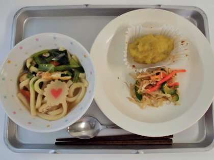 献立 五目うどん、もやしの和え物、スイートポテト、牛乳