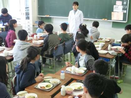 6年生にとっては、小学校生活最後の給食。栄養士さんが6年生の教室を回ってお話をしてくれました。
