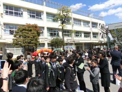 ここ数日の寒さも収まり、春めいた青空の下、みんな元気に巣立っていきました。立派な中学生になってください。