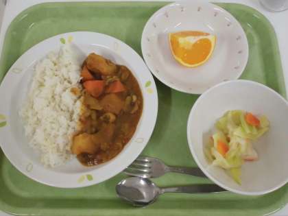 献立 チキンカレーライス、キャベツサラダ、清見オレンジ、牛乳