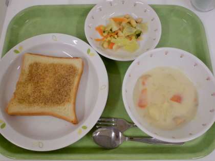 献立 セサミトースト、クリームシチュー、大豆入りゆで野菜、牛乳