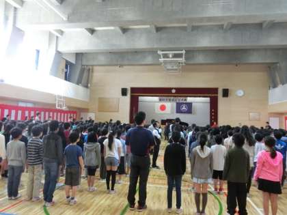 今日のモジュールタイムは音楽集会です。明日の落成式で歌う国歌や、校歌の練習を行いました。