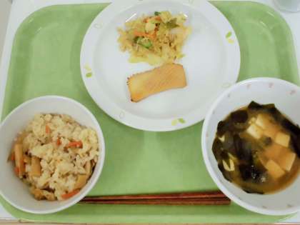 献立 たけのこご飯、いかのしょうが焼き、アスパラ入りごま和え、豆腐とわかめのみそ汁、牛乳
