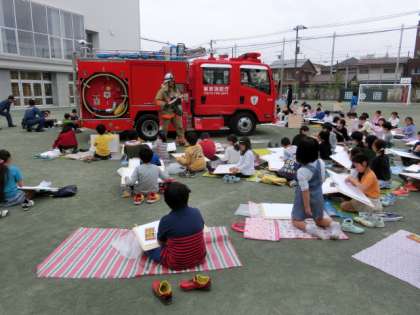 今日は2年生とくるみ学級のみんなで、消防車を写生します。