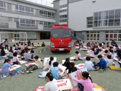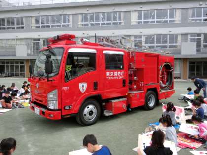 どの子も赤いクレヨンを握りしめ、深紅のポンプ車を画用紙いっぱいに描きました。