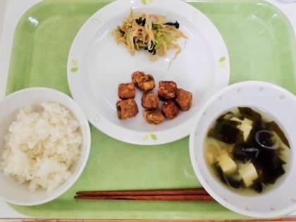 献立 ご飯、かつおの竜田揚げ、野菜のごまだれかけ、若竹汁、牛乳