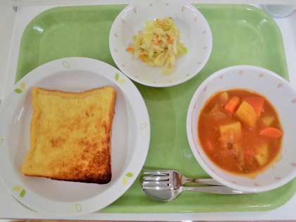 献立 フレンチトースト、トマトシチュー、きのこ入りキャベツサラダ、牛乳