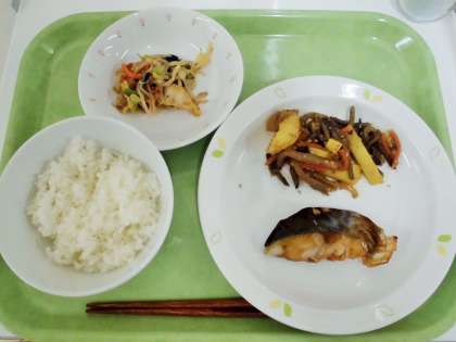 献立 ご飯、さわらの甘酢あんかけ、じゃが芋のきんぴら、野菜のおかかかけ、牛乳