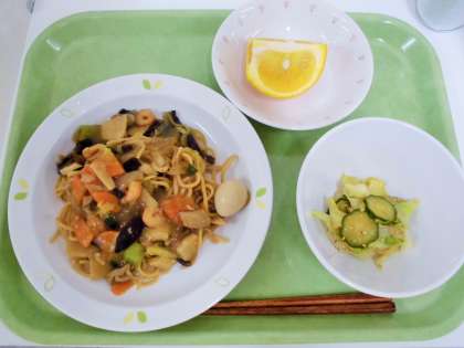 献立 五目あんかけそば、キャベツの中華サラダ、甘夏みかん、牛乳
