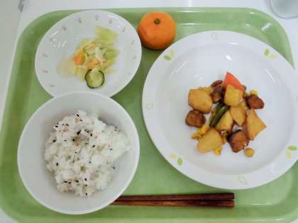 献立 ごまご飯、魚とじゃが芋の揚げ煮、塩だれキャベツのサラダ、冷凍みかん、牛乳
