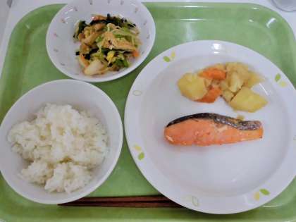 献立 ご飯、鮭の塩こうじ焼き、じゃが芋の炒め煮、油揚げ入りお浸し、牛乳