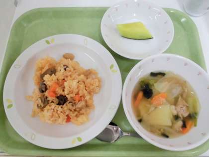献立 チキンライス、いんげん豆と野菜のスープ煮、メロン、牛乳