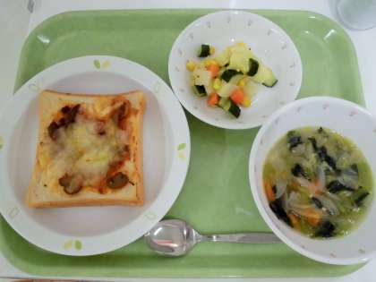 献立 ピザトースト、野菜スープ、コロコロポテトサラダ、牛乳