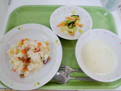 献立 ハムピラフ、ポテトクリームスープ、ひよこ豆入りゆで野菜、牛乳