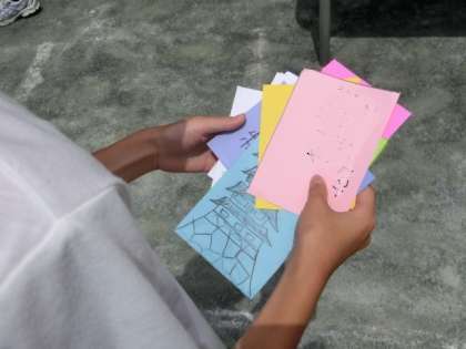 5分間のゲームで、30人ほどの児童が、すべての色をコンプリートできました。7色はそろわなくても、みんなの個性的な名刺は見ていて楽しいものでした。