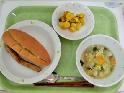献立 セルフウインナードッグ、ABCスープ、かぼちゃのホットサラダ、牛乳