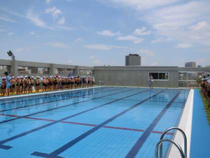 できたての新造プールです。プールにとっても初めての授業、初めての子どもたちです。
