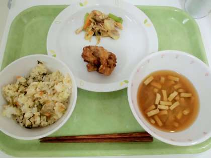 献立 野沢菜ご飯、鶏肉のさんぞく焼き、きのこ入りおかか和え、凍り豆腐のみそ汁、牛乳