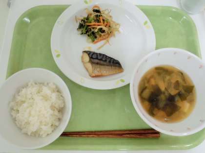 献立 ご飯、さばのピリ辛ソースかけ、野菜のごま和え、豆腐とわかめのみそ汁、牛乳