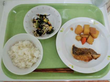 献立 ご飯、ホキの変わりソース、じゃが芋の煮物、ひじきサラダ、牛乳