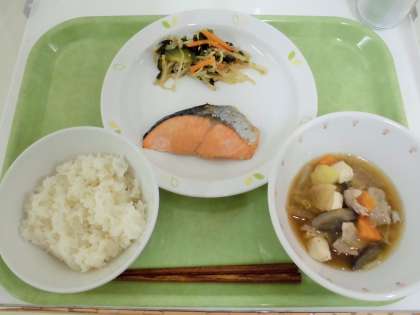 献立 ご飯、鮭のレモン風味、もやしとわかめの和え物、豚汁、牛乳