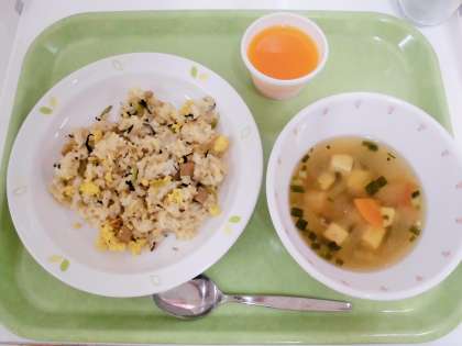 献立 青菜チャーハン、とうがんスープ、キャロットゼリー、牛乳