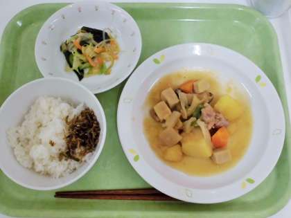 献立 ご飯、ピーマンふりかけ、鶏肉とじゃが芋のうま煮、海藻サラダ、牛乳