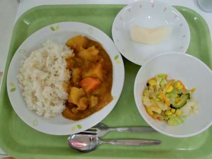 献立 カレーライス、コーンサラダ、梨、牛乳